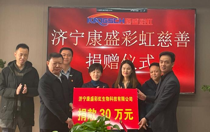 On February 23rd, Jining Kangsheng Caihong Biotechnology Co., Ltd. held a charity donation ceremony. Li Changying, member of the Standing Committee of the County Committee and Director of the Development Zone Management Committee, and Zhang Benli, President of the County Charity Federation, attended the ceremony. Kangsheng Group Chairman Meng Xinguo attended and presided over the ceremony, accompanied by relevant department heads such as Administrative Director Yan Wei, General Manager Meng Yifan, and Kangsheng Rainbow General Manager Wang Suo.